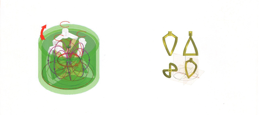 合理的流場(chǎng)設(shè)計(jì)是決定攪拌設(shè)備攪拌結(jié)果的要點(diǎn)。為了達(dá)到用戶生產(chǎn)工藝多組分、多配方的需求,以及對(duì)物料粘度的流動(dòng)性的特點(diǎn),將攪拌流場(chǎng)設(shè)計(jì)成沿公轉(zhuǎn)方向的螺旋式推進(jìn)湍流流場(chǎng)。這種流場(chǎng)可以使攪拌混合與分散混合在相匹配的公轉(zhuǎn)及自轉(zhuǎn)速度下,建立起穩(wěn)定的物料三維湍流,進(jìn)而達(dá)到混合要求。